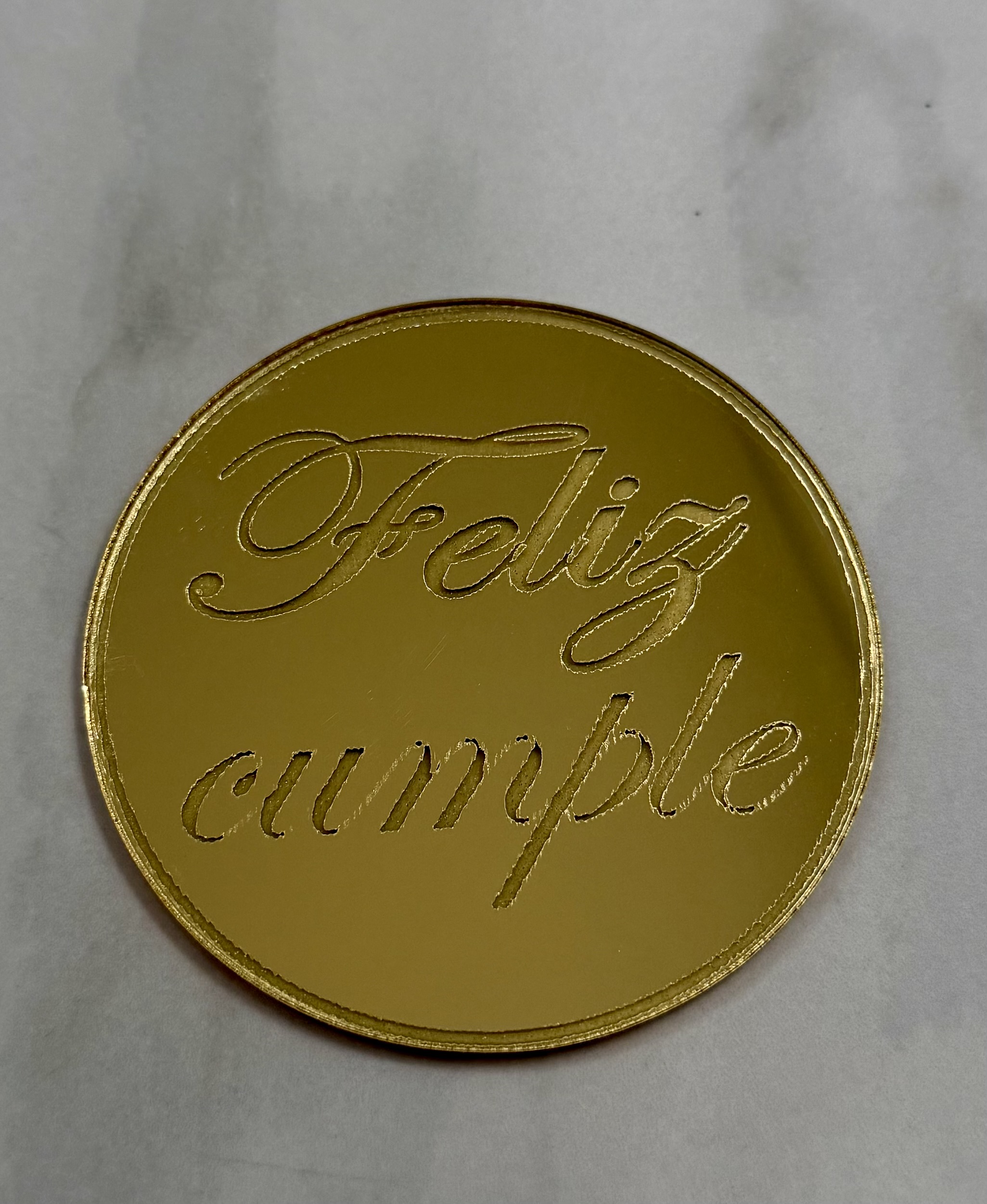 Círculo de acrílico espejado de 7,5 cm de diámetro , con leyenda “ Feliz cumple”